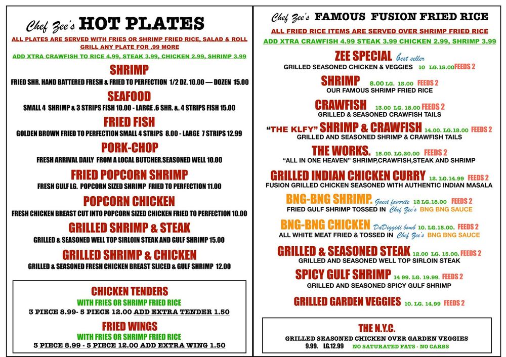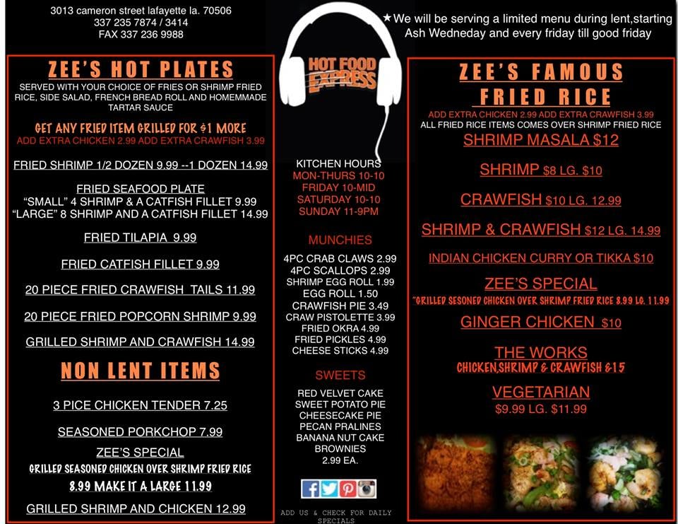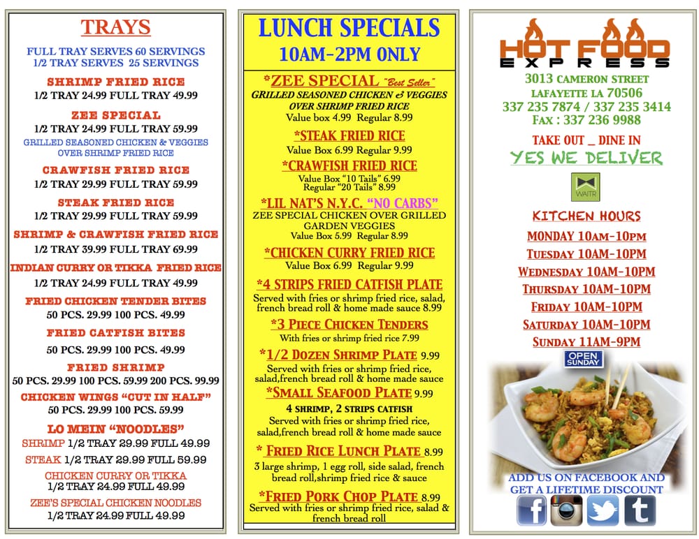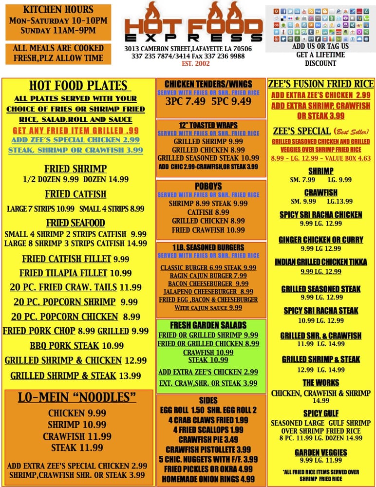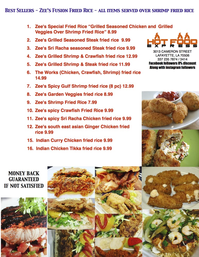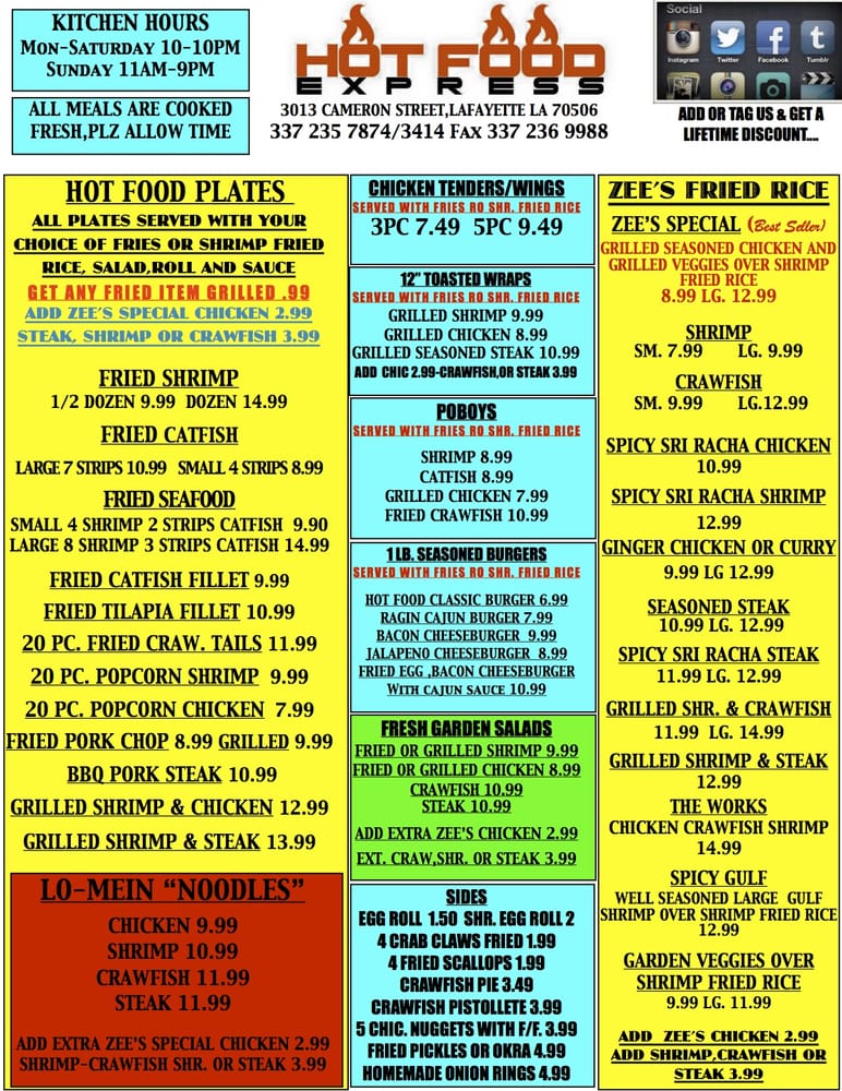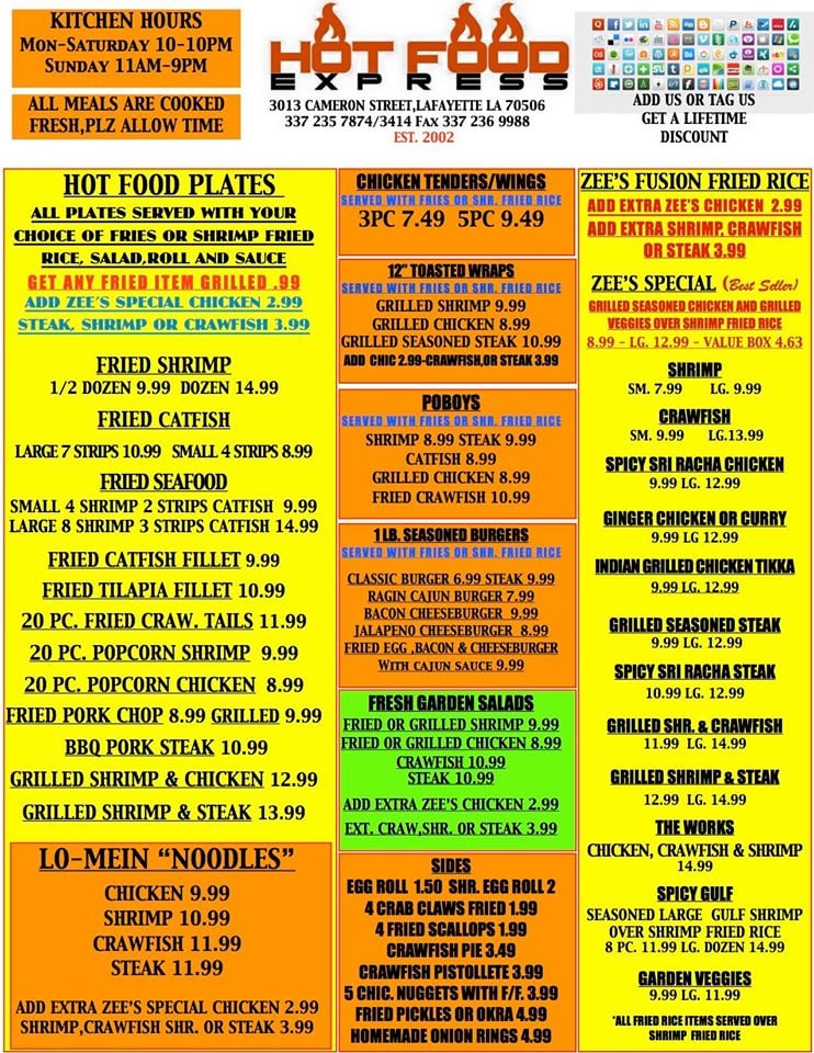 Hot Food Express offers a fusion of New American and seafood dishes, with Chef Zee's specialties like the Fried Popcorn Chicken and Bang Bang Shrimp Fried Rice standing out. The restaurant provides various amenities like delivery, takeout, outdoor seating, and Wi-Fi. Customers praise the large portions and freshness of the food, with favorites like the Bang Bang Shrimp receiving high acclaim. The reviews indicate satisfaction with the quality and taste of the dishes, with some even calling Hot Food Express a hidden gem in Lafayette. Overall, the menu showcases a mix of familiar favorites and unique flavors, making it a must-try for those seeking Southern-inspired dishes with a twist.